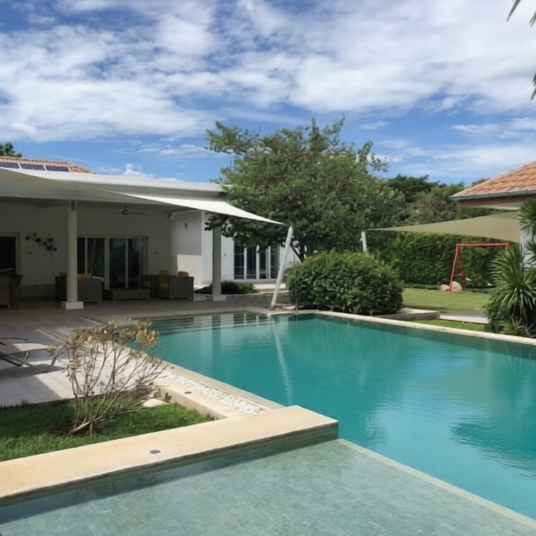 Explore this stunning pool villa by English developer in popular Hua Hin area. Fully furnished with 4 beds, guest house & large pool!