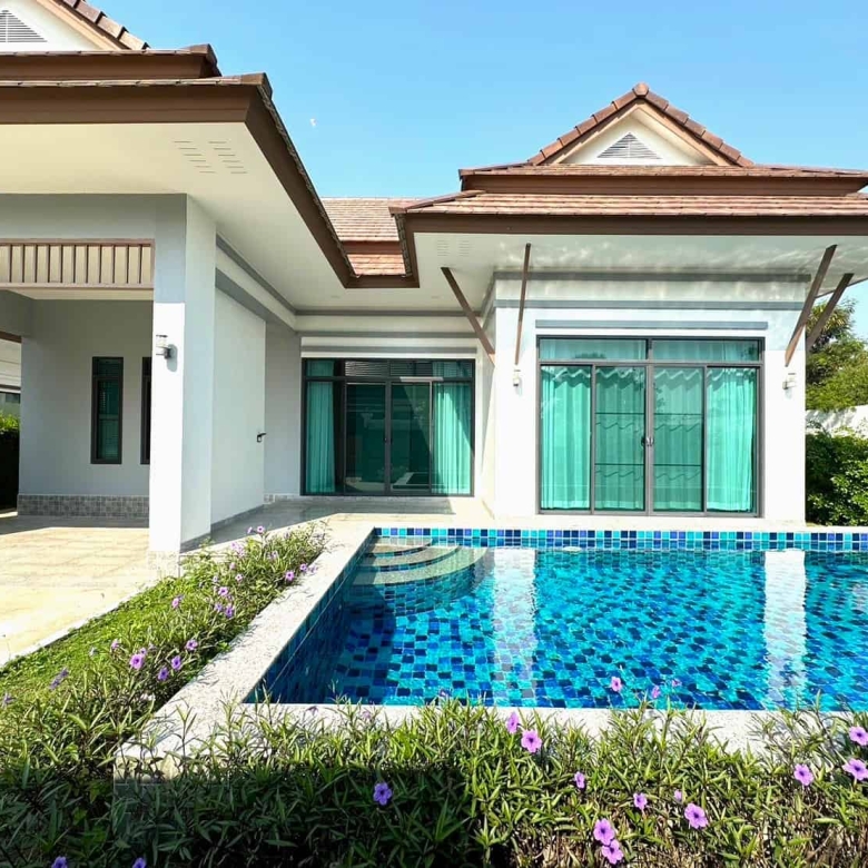 Discover this fully furnished 3BR Balinese pool villa in Plumeria Hua Hin. 372 sqm land, private pool, near Palm Hills Golf Course.