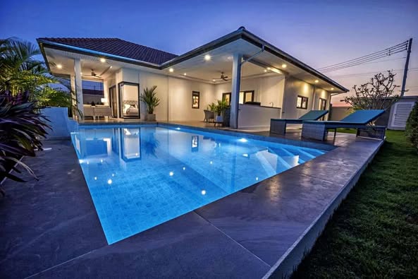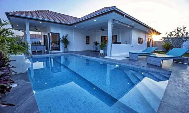 Orchid Palm Homes presents the Signature Plus Villa, a modern pool villa for sale in the sought-after Mali Bua development in Hua Hin. This property is designed for comfort and a relaxed tropical lifestyle, offering everything needed for outdoor living.