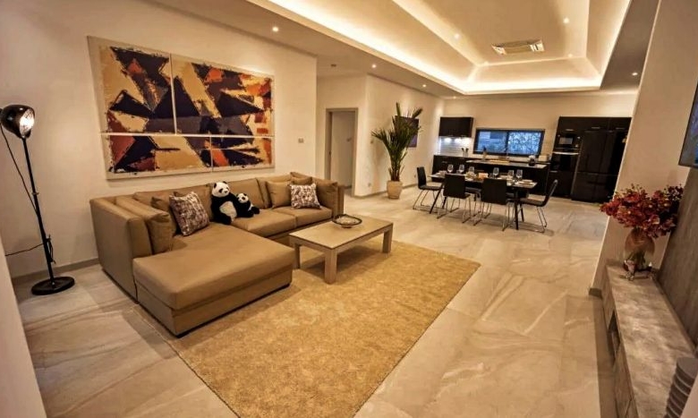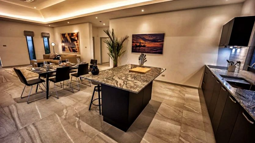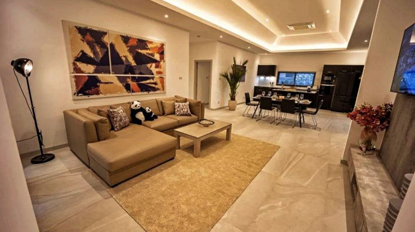 Step inside to find 202 sqm of open-plan living space on a land plot of over 500 sqm. The villa features 3 spacious bedrooms and 2 bathrooms, with high vaulted ceilings creating a refreshing sense of space. The fully equipped European-style kitchen is perfect for entertaining.