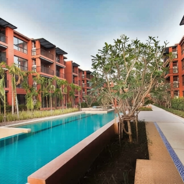 Residents enjoy access to comprehensive resort-style facilities including two swimming pools, a modern fitness center, sand valley, beautifully maintained green gardens, and a relaxing outdoor tea room. The development consists of three low-rise buildings housing 448 units across total project area, with maintenance fees set at an affordable 40 baht per square meter.